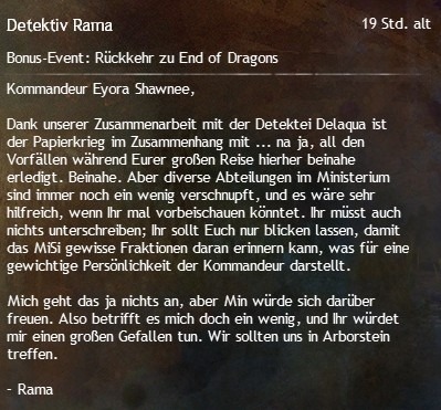 Bei der Rückkehr zu End of Dragons bittet Detektiv Rama uns darum, ihn in Aborstein zu besuchen. Dazu erhaltet Ihr nach dem Einloggen einen Brief. Damit die Bevölkerung sich an unsere Taten in Cantha erinnern kann und die Behörden diese besser bewerten können, sollen wir unsere Abenteuer wiederholen.