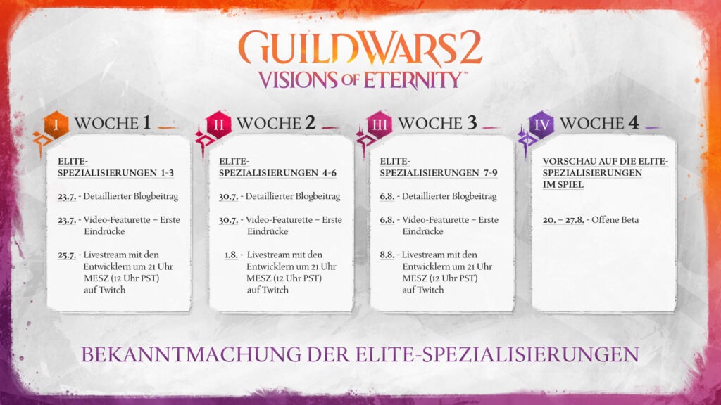 Diese Woche dreht sich alles um Mesmer, Waldläufer und Wächter! Schaut diesen Freitag, 25. Juli, um 21 Uhr MESZ (12 Uhr PST) bei unserem Twitch-Kanal vorbei, um eine Live-Vorschau auf diese Elite-Spezialisierungen zu erleben. Außerdem könnt ihr alle Elite-Spezialisierungen selbst spielen während unseres Beta-Events vom 20. August, 18 Uhr MESZ (9 Uhr PST), bis 28. August, 7 Uhr MESZ (27. August, 22 Uhr PST).
