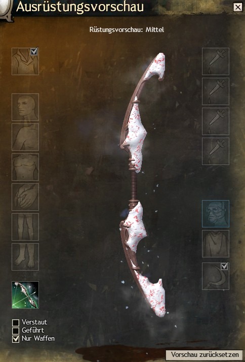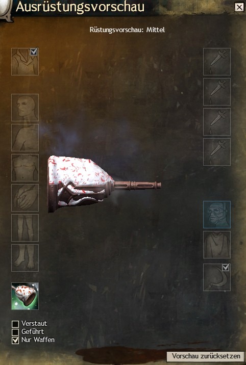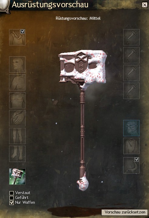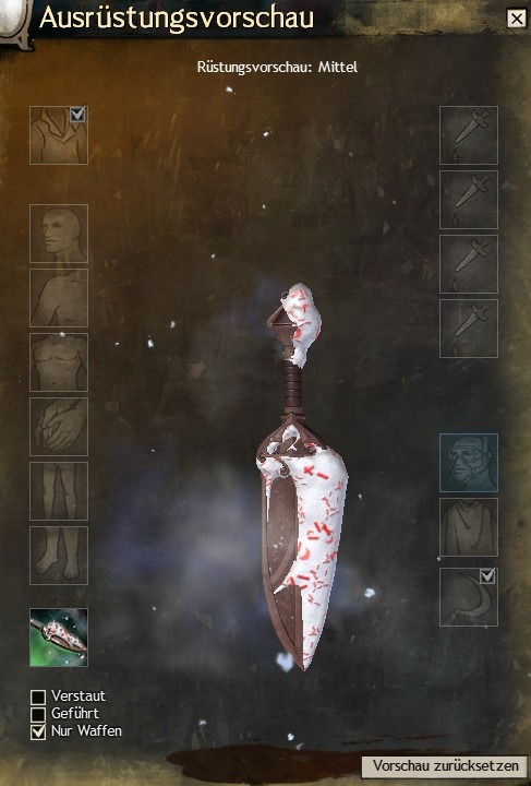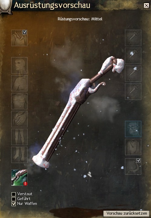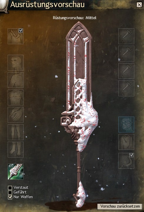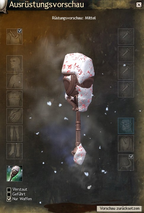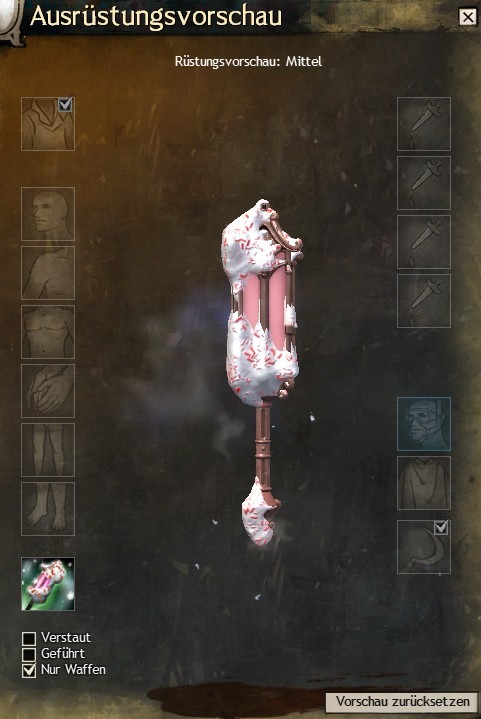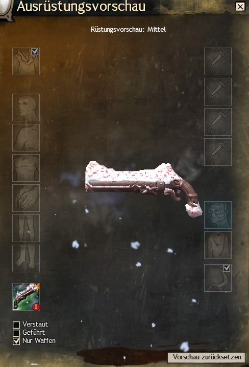 Es sind schlicht gehaltene Waffen aus Metall. Wurde die Waffe gezogen, erscheint ein Gestöber und bedeckt die Waffe mit Puderzucker und Streuseln.