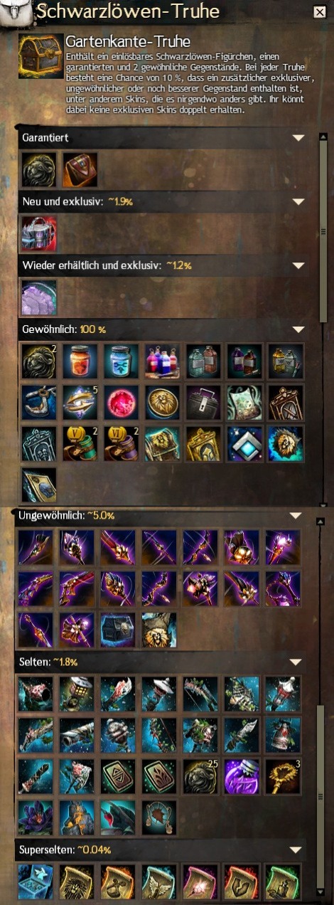 Mit dem heutigen Patch kam auch eine neue Schwarzlöwentruhe ins Spiel, die Gartenkante-Truhe.