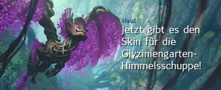Die neue Glyziniengarten-Himmelsschuppe kam zwar am 1. April in den Edelsteinshop, aber sie ist absolut kein Aprilscherz. Dieser Himmelsschuppe aus uraltem Holz wächst an vielen Stellen Blauregenblüten. Egal ob ihr euch in den Lüften bewegt oder eurer Himmelsschuppe auf dem Boden einen kleinen Snack gönnen wollt, ihr werdet immer wieder herabfallende Blauregenblütenblätter sehen können. Für diesen naturbelassenen Skin braucht ihr 1600 Edelsteine.