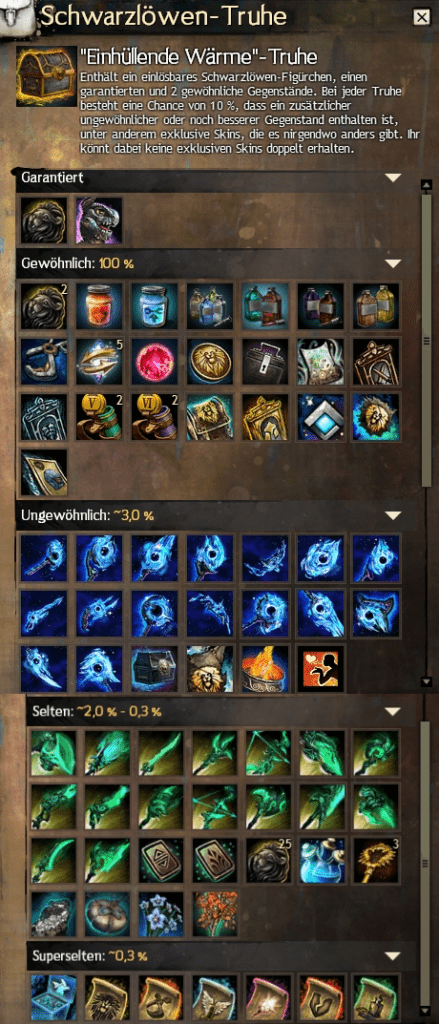 Mit dem heutigen Patch kam auch eine neue Schwarzlöwentruhe ins Spiel, die „Einhüllende Wärme“-Truhe.