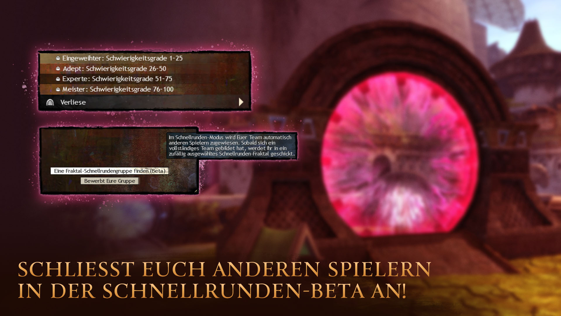 Im Gruppensuche-Interface könnt ihr unter „Fraktale der Nebel“ auf den Schnellrunde-Modus zugreifen (Eingeweihter: Schwierigkeitsgrade 1–25) oder indem ihr das rote Banner vor dem Fraktal-Portal in Löwenstein anklickt. In der folgenden Liste findet ihr eine Auswahl der aktuell für eine Schnellrunde verfügbaren Fraktale: