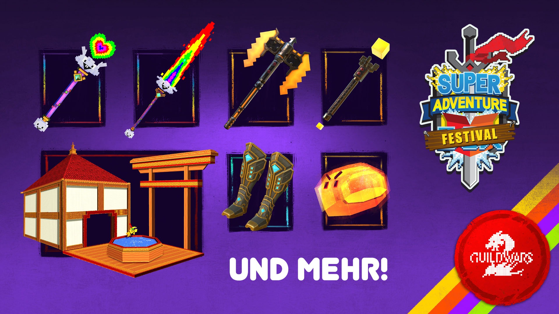 Die Super Adventure Box war ursprünglich als Aprilscherz von ArenaNet ins Spiel gebracht worden und sollte die Spieler in eine kleine 8-Bit-Welt entführen. Passend dazu wurde eine lustige Preview-Seite erstellt, wo die SAB als neues Produkt beworben und scherzhaft als die Grafik-Sensation vorgestellt wurde. Mit dabei auch ein Video, das an alte Videospiel-Trailer angelehnt war.